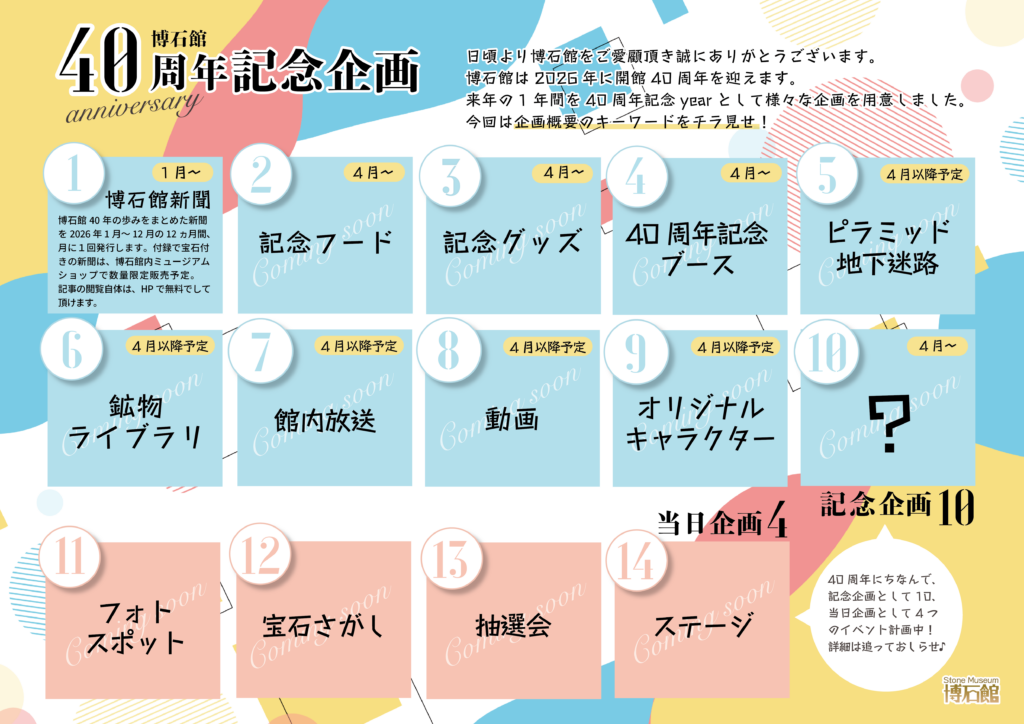40周年を記念して、博石館のこれまでの歩みをまとめた博石館新聞を2026年1月~12月の12ヵ月間、月に1回発行します。